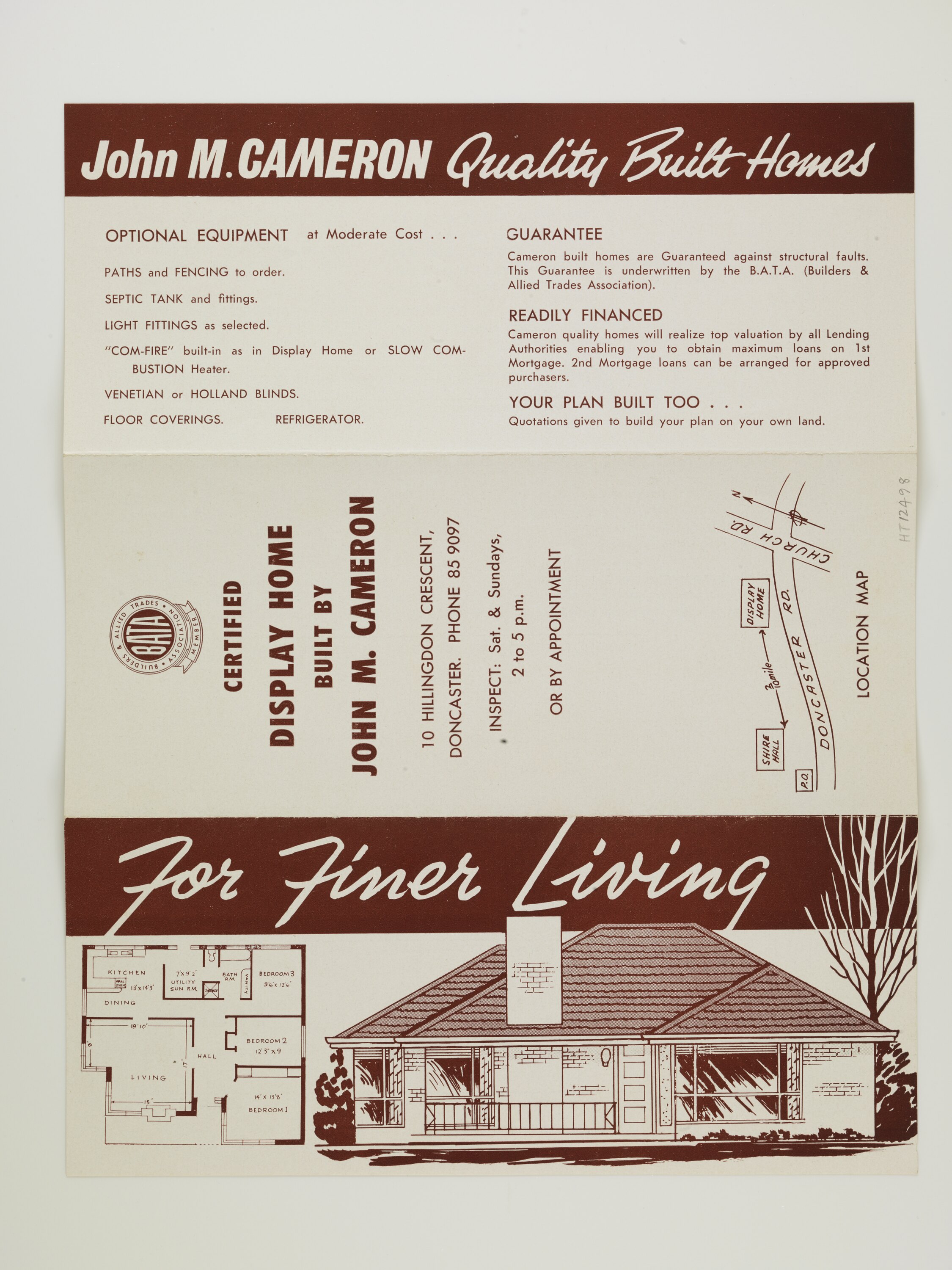 Front: "For Finer Living" Back: "BUILDERS AND ALLIED TRADES ASSOCIATION / CERTIFIED / DISPLAY HOME / BUILT BY / JOHN M. CAMERON / 10 HILLINGDON CRESCENT / DONCASTER. PHONE 85 9097 / INSPECT: Sat & Sundays, / 2 to 5 p.m. / OR BY APPOINTMENT / (Map of location drawing) "