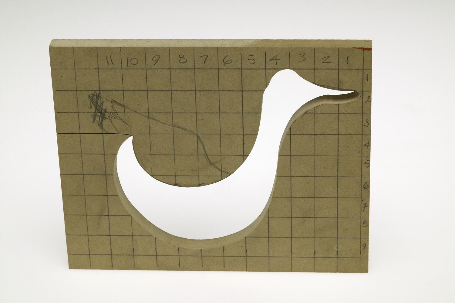 MDF pattern reverse. Rectangle with duck shape cut away. Squares and numbers marked out in pencil. Wing and corrections drawn in. Excellent condition.