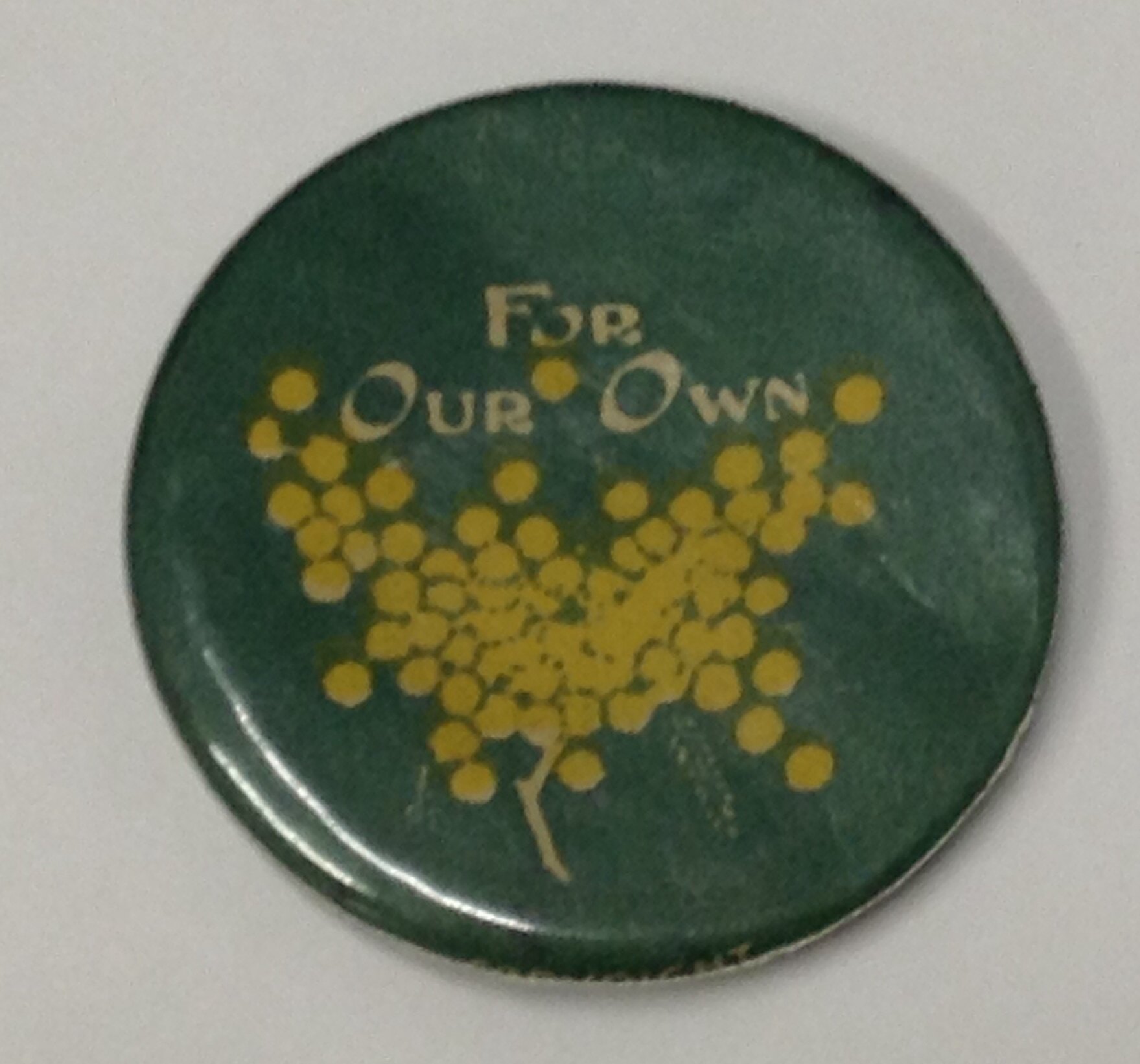 Badge depicting a branch of wattle flowers. The reverse has a pin (made from a bent clothing pin) for wearing.