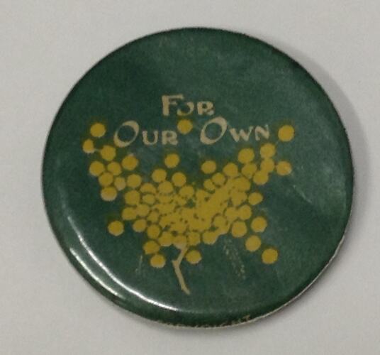 Depicts a branch of wattle flowers; above: FOR OUR OWN