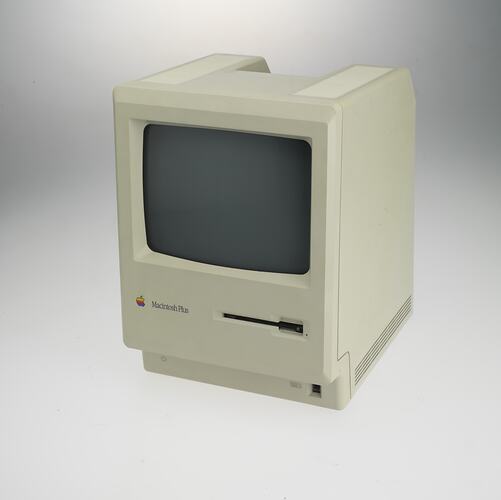 Front of computer: [Colour Apple logo] Macintosh Plus Back of computer: [Black Apple logo] Macintosh Plus 1Mb Bottom of computer: [Barcode] *F7282DUM001AP* Dymo label, top of computer: PCEK.9