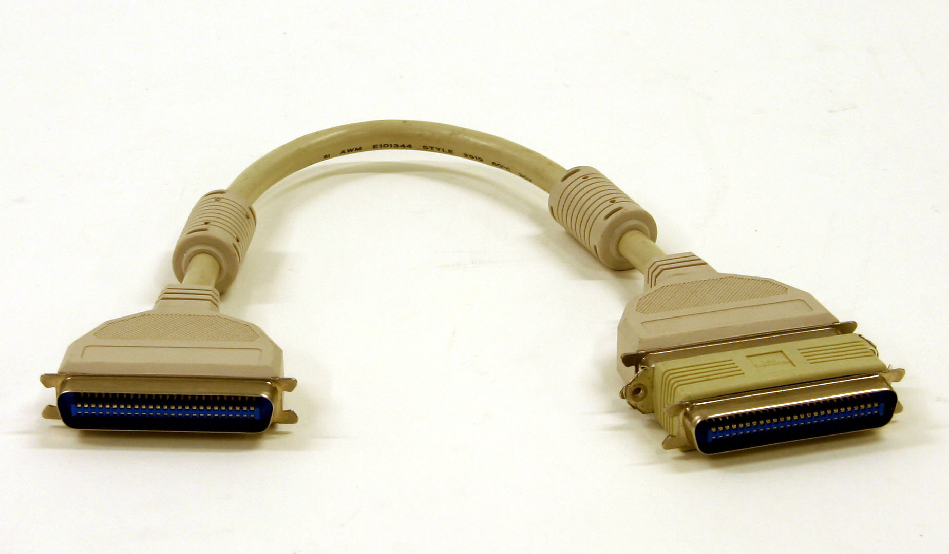 A multi-core cable terminatd at each end with 50 pin D-type plugs. The cable includes two ferrite RFI suppressors. One terminator is plugged into a SCSI male to female adaptor/terminator.