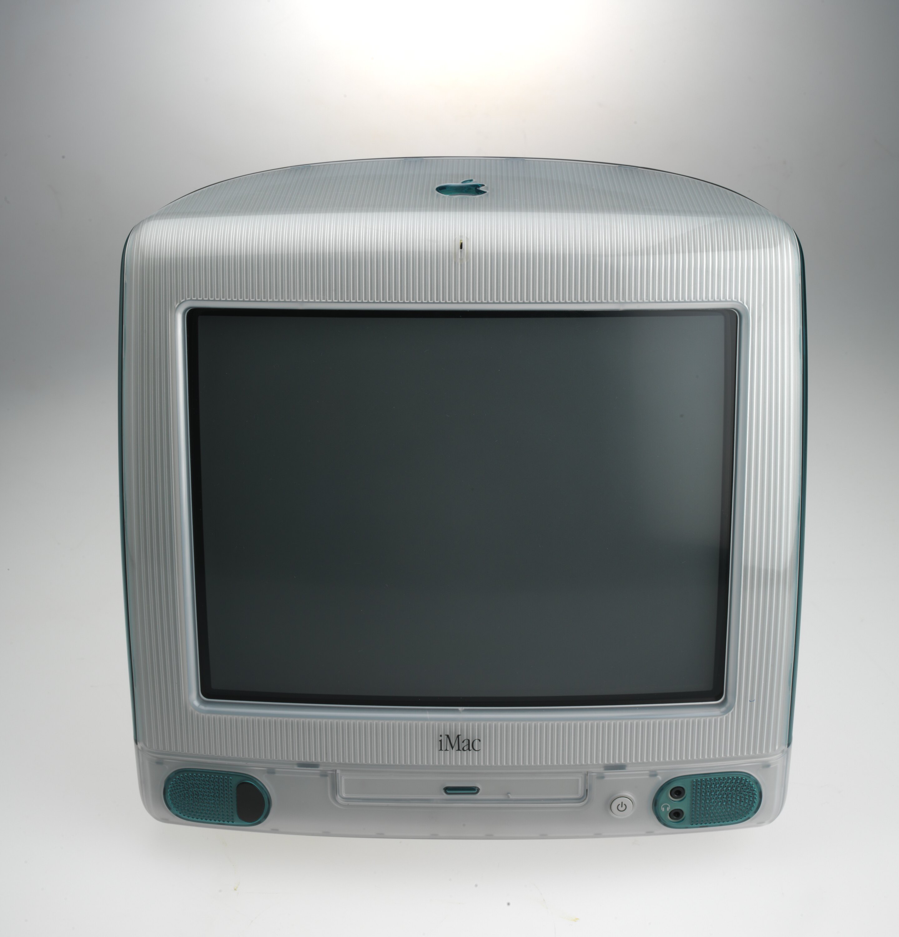 Apple iMac - a fully self-contained computer, monitor with a built in tray Loading CD ROM drive . It has a 'Bondi Blue' colour semi transparent casing with grey striped monitor surrounds. The front surrounds has a built in microphone above the screen, and built in stereo speakers on lower front, either side of the CD drawer. A panel opens on the right hand side of the casing, that allows access to a connection hub panel. This hub comprisies of a microphone input, speaker output, two USB connectors, one either net connector, and telephone input for the internal modem. It also includes a reset and abort pin hole button, usually accessed with a standard paper clip. An indentation in the top of the case allows the computer to be lifted and carried. On the underside of the casing is a fold out bracket to raise the level of the computer.