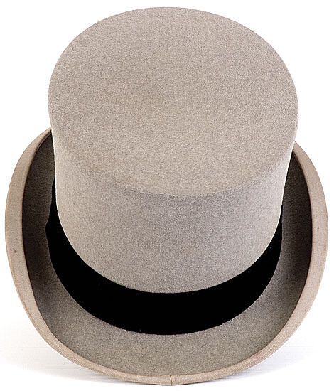 Grey top hat with black band purchased at Henry Buck's Menswear store in Melbourne by Sir Reginald Myles Ansett on 21 October 1966. The hat was made by Woodrow Hatters, Picadilly, London, circa 1966.