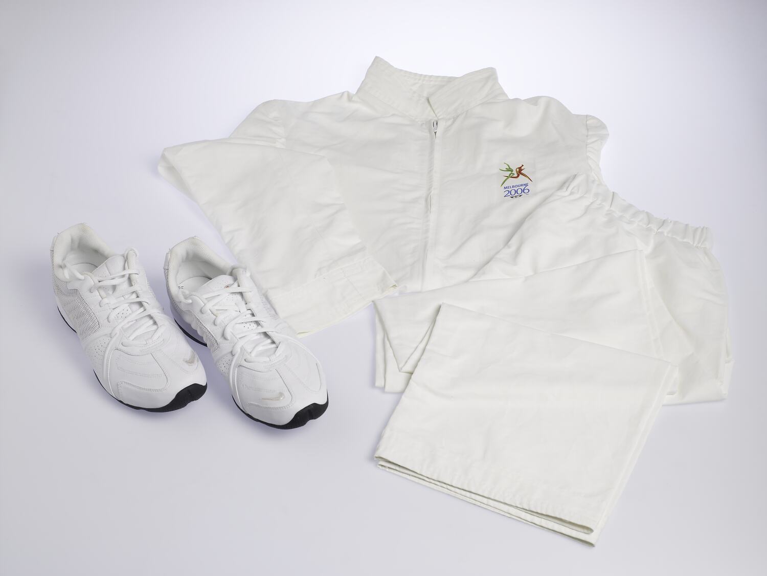 White track suit worn by the then Governor of Victoria, Mr John Landy, when he ran the final leg of the Melbourne 2006 Commonwealth Games Queen's Baton Relay. Mr Landy presented the baton to Her Majesty Queen Elizabeth II at the Melbourne Cricket Ground on 15 March 2006, during the Opening Ceremony of the Games.
