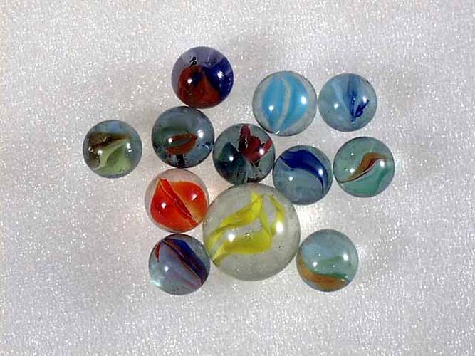This collection of marbles is typical of contemporary, mass-produced marbles manufactured overseas and imported into Australia in the latter half of this century. This type of marble is common in Australian playgrounds and throughout the world. Most of these marbles are known as Cat's Eyes.