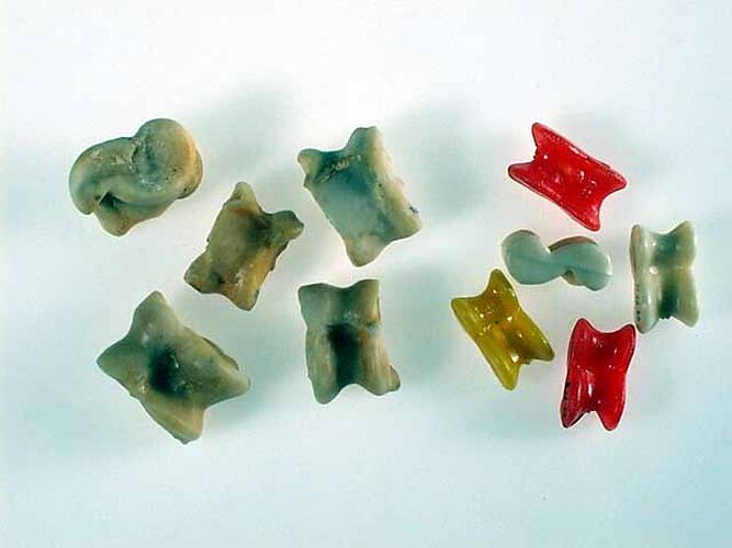 Knucklebones, or Jacks, is an ancient game, dating back to prehistoric times. The first jacks were natural materials - animal bones, stones, seeds and shells. Sheep's knucklebones were the most common type of jacks in Australia during the first half of this century, and children would colour them by boiling them in water with ink or dye. During the 1950s, mass-produced plastic knucklebones became available. These objects are examples of the very earliest type of mass-produced plastic replica knucklebones used by Australian children to play the game of Jacks. The size, shape and weight of real sheeps' knucklebones were replicated, in contrast to later versions which are much smaller and lighter.