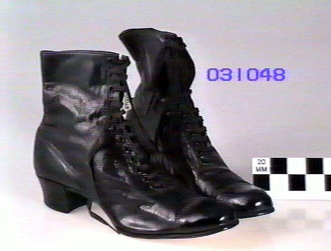 Pair of woman's black leather lace-up boots. Made by Bostock, England, before or during 1880. The boots won the gold medal for design and workmanship at the 1880-1881 International Exhibition.