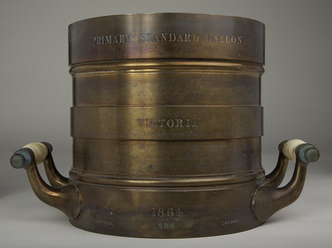 Primary standard gallon for Victoria, 1864. The measure has two handles, a strike disc and is housed in a wooden box. It was originally used by the Customs Department as the Imperial standard measure for Victoria. Transferred to Melbourne Observatory in 1902 when the observatory took over responsibility for administering primary standards of weights and measures for Victoria.