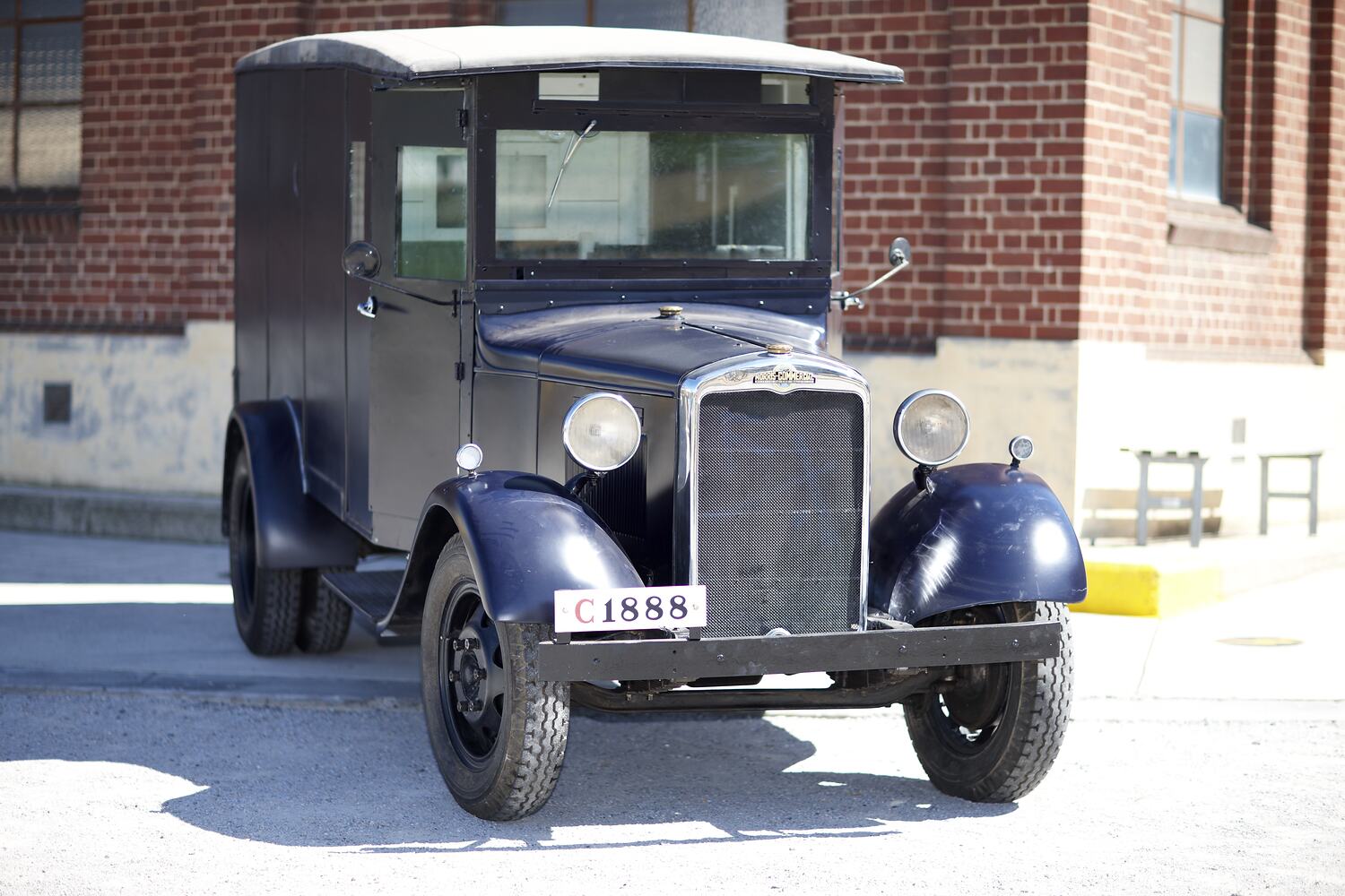 Radiator badge reads: 'MORRIS COMMERCIAL CARS LTD. / MORRIS-COMMERCIAL / BRITISH TO THE BACKBONE / BIRMINGHAM, ENGLAND' over an image of The World Globe.