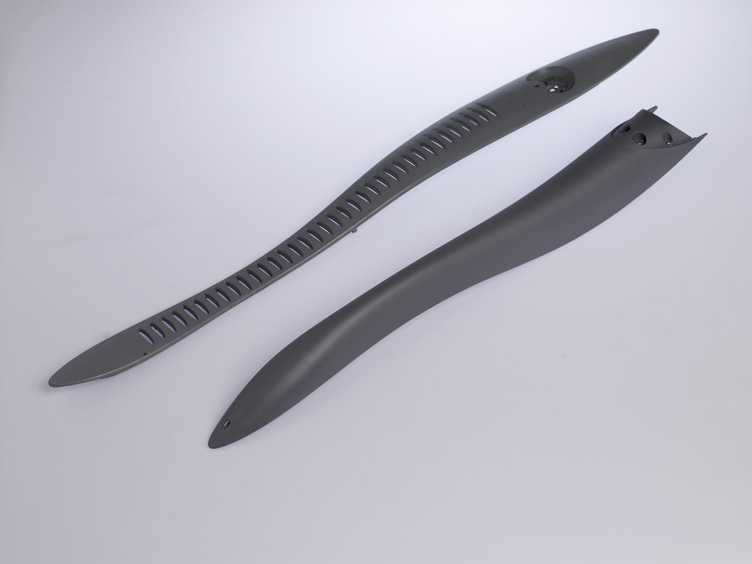 Grey plastic to scale prototype of Melbourne 2006 Queen's Baton. Long, curved at the center and cut off at one end. Four indented holes for screws line a recessed semi-circle at one end.