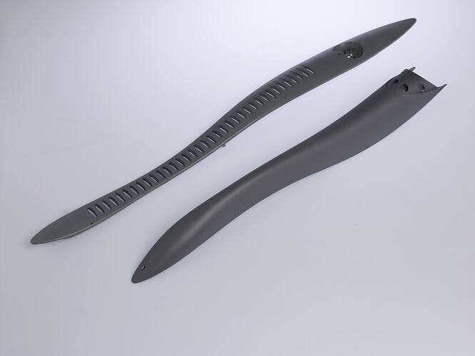 Grey plastic to scale prototype of the Melbourne 2006 Queen's Baton. Long and curved towards the middle, vent holes run the length of the model. A recessed circle at one end has holes for screws.