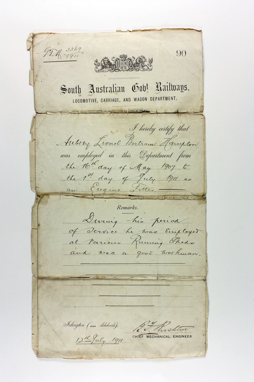 Certificate of employment for Aubrey Lionel Bertram Hampton as an engine fitter for the South Australian Government Railways from 1907 until 1911.