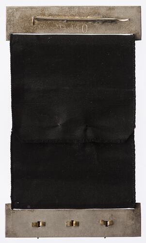 Black ribbon, machine-embroidered in gold with wattle sprigs, a Rising Sun badge with motto AUSTRALIAN MILITARY FORCES, and the words FOR AUSTRALIA, ribbon. The badge is suspended from a white metal bar impressed with laurel leaves within a chain border. Three gold stars are attached to the bottom bar. The back of the top bar is stamped 9940 below a pin for attaching to clothing.