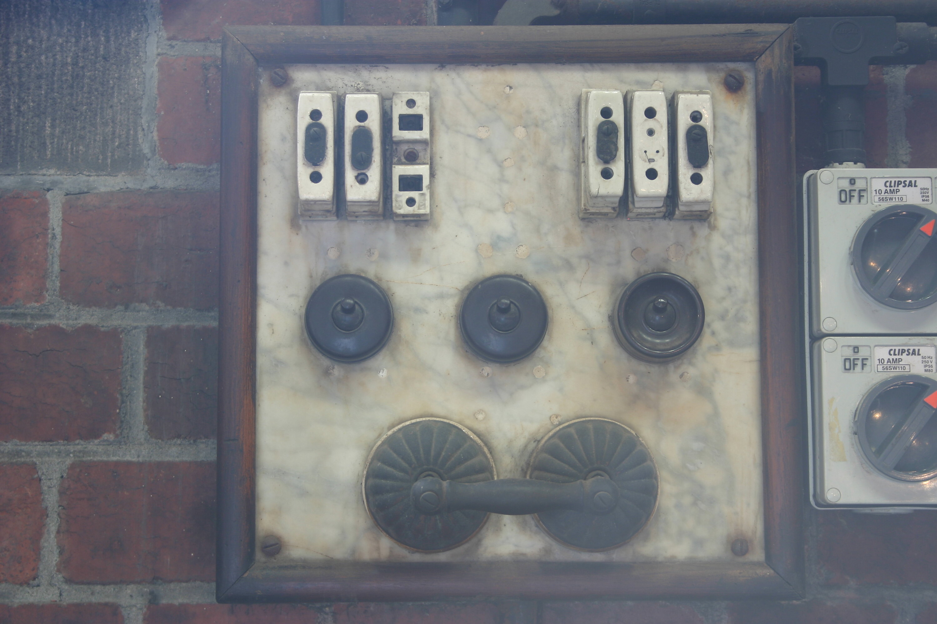 Electrical switchboard with fuses. White marble faced. Located in North Engine Room. Believed to be part of the original electrical installation at the Spotswood Sewerage Pumping Station..