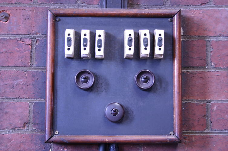 Square panel with a wooden frame and black face. Extensive white bloom visible across face of board. Metal screw heads visible at each corner. There are two sets of three white, rectangular, ceramic fuses mounted along the top edge of the panel; and three round, brown, Bakelite light switches below. The wood has been stained brown.