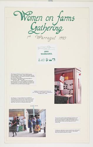 History board created for the heritage display at the North East (Beechworth) Gathering in 2001, illustrating the highlights of the 1990 Warragul Women on Farms Gathering.This display was prepared by North East (Beechworth) committee member Rhonda Diffey, and also featured the icons and history boards from all the gatherings up to 2000. From this emerged a partnership with Museum Victoria (formally signed at the Yarram Gathering in 2003) to document the history of the Women on Farms Gathering; these icons and history boards were then acquired as part of the Victorian Women on Farms Gathering Collection. History boards were subsequently prepared by each organising committee, and displayed together at many gatherings.