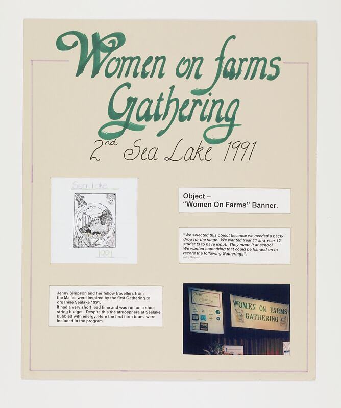 History board created for the heritage display at the North East (Beechworth) Gathering in 2001, illustrating the highlights of the 1991 Sea Lake Women on Farms Gathering.This display was prepared by North East (Beechworth) committee member Rhonda Diffey, and also featured the icons and history boards from all the gatherings up to 2000. From this emerged a partnership with Museum Victoria (formally signed at the Yarram Gathering in 2003) to document the history of the Women on Farms Gathering; these icons and history boards were then acquired as part of the Victorian Women on Farms Gathering Collection. History boards were subsequently prepared by each organising committee, and displayed together at many gatherings.