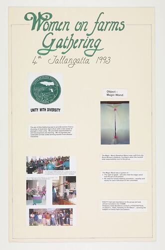 History board created for the heritage display at the North East (Beechworth) Gathering in 2001, illustrating the highlights the 1993 Tallangatta Women on Farms Gathering. This display was prepared by North East (Beechworth) committee member Rhonda Diffey, and also featured the icons and history boards from all the gatherings up to 2001. From this emerged a partnership with Museum Victoria (formally signed at the Yarram Gathering in 2003) to document the history of the Women on Farms Gathering. These icons and history boards were then acquired as part of the Victorian Women on Farms Gathering Collection. Following the 2001 display history boards were prepared by each organising committee, and displayed as a collection at many subsequent gatherings.
