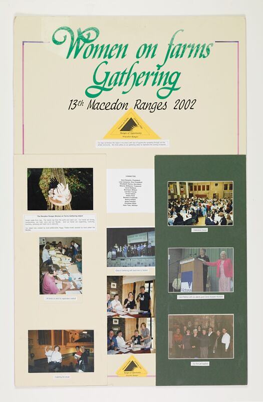 According to the 2001 North East (Beechworth) proceedings, the creation of the history boards was intended to 'encourage the acquisition of further information and photographs, and to provide an example of what may become a permanent collection.' Members of the North East (Beechworth) organising committee were keenly aware of the importance of the Victorian Women on Farms Gatherings to the wider history of the Australian rural women's movement, and also to Australian history more generally. 'Our Gathering feels that we would like to preserve and conserve these tokens/objects for posterity', stated the North East (Beechworth) Gathering proceedings, 'as they are of high significance.' To this end, a unanimous decision was made at the Gathering to approach Museum Victoria about preserving the history of the Gatherings. A Heritage Group was formed among Gathering participants and in 2003 a formal partnership was signed between Museum Victoria and the Victorian Women on Farms Gathering community. This agreement - titled the Agreement Between Museums Board of Victoria and Victorian Women on Farms Gathering - laid out a vision to 'protect, preserve, document, exhibit and enhance access and understanding of the stories relating to Victorian Women on Farms Gatherings.'