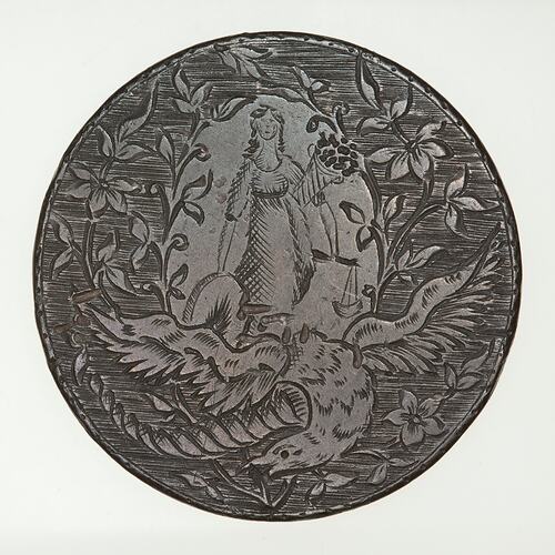 Coin with original obverse of George III removed. Design shows a young woman holding scales and a possibly a wheel with a cornucopia under one arm, with a bird with outstretched wings. Decorative floral background. Reverse shows Britannia. The reverse is damaged in the centre.