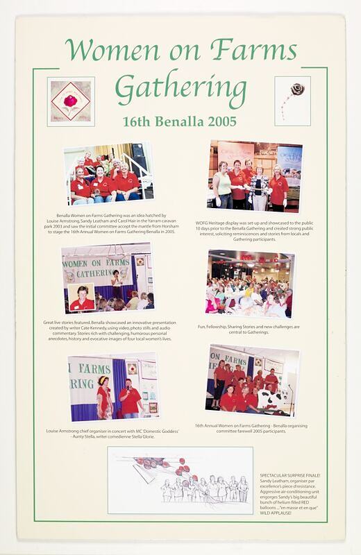 According to the 2001 North East (Beechworth) proceedings, the creation of the history boards was intended to 'encourage the acquisition of further information and photographs, and to provide an example of what may become a permanent collection.' Members of the North East (Beechworth) organising committee were keenly aware of the importance of the Victorian Women on Farms Gatherings to the wider history of the Australian rural women's movement, and also to Australian history more generally. 'Our Gathering feels that we would like to preserve and conserve these tokens/objects for posterity', stated the North East (Beechworth) Gathering proceedings, 'as they are of high significance.' To this end, a unanimous decision was made at the Gathering to approach Museum Victoria about preserving the history of the Gatherings. A Heritage Group was formed among Gathering participants and in 2003 a formal partnership was signed between Museum Victoria and the Victorian Women on Farms Gathering community. This agreement - titled the Agreement Between Museums Board of Victoria and Victorian Women on Farms Gathering - laid out a vision to 'protect, preserve, document, exhibit and enhance access and understanding of the stories relating to Victorian Women on Farms Gatherings.'