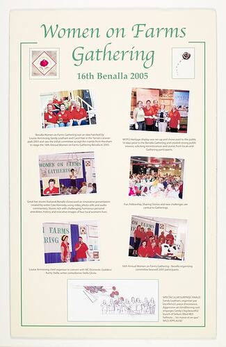 History board created by the 2005 Benalla Women on Farms Gathering organising committee. It features images and text which illustrate the highlights of this gathering.