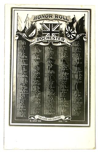 Front, printed: "HONOR ROLL / ROCHESTER / SHIRE / FOR GOD AND EMPIRE / THE GREAT WAR 1914-191" [final digit missing] Reverse, printed: "POST CARD / CORRESPONDENCE ADDRESS ONLY"