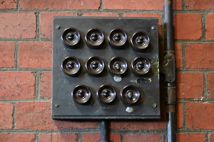 Electric light control switchboard with 11 switches. Located in the North Engine Room.