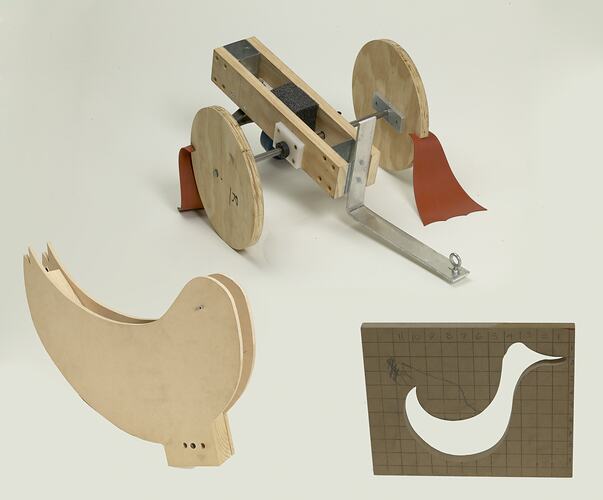 A central plank with a rear wheel, connected to an axle and two wheels, this mechanism was one of the earliest attempts at building the Toy Duck that featured in the Opening Ceremony of the Melbourne 2006 Commonwealth Games. The axle is off-set to produce a 'waddling' effect when the body is pulled forwards. This type of structure and mechanism under pins the final version of the Toy Duck, as used in the Ceremony. This was one of the earliest attempts that the Ceremonies Team's Workshop made at developing a mechanism to make the Toy Duck waddle.