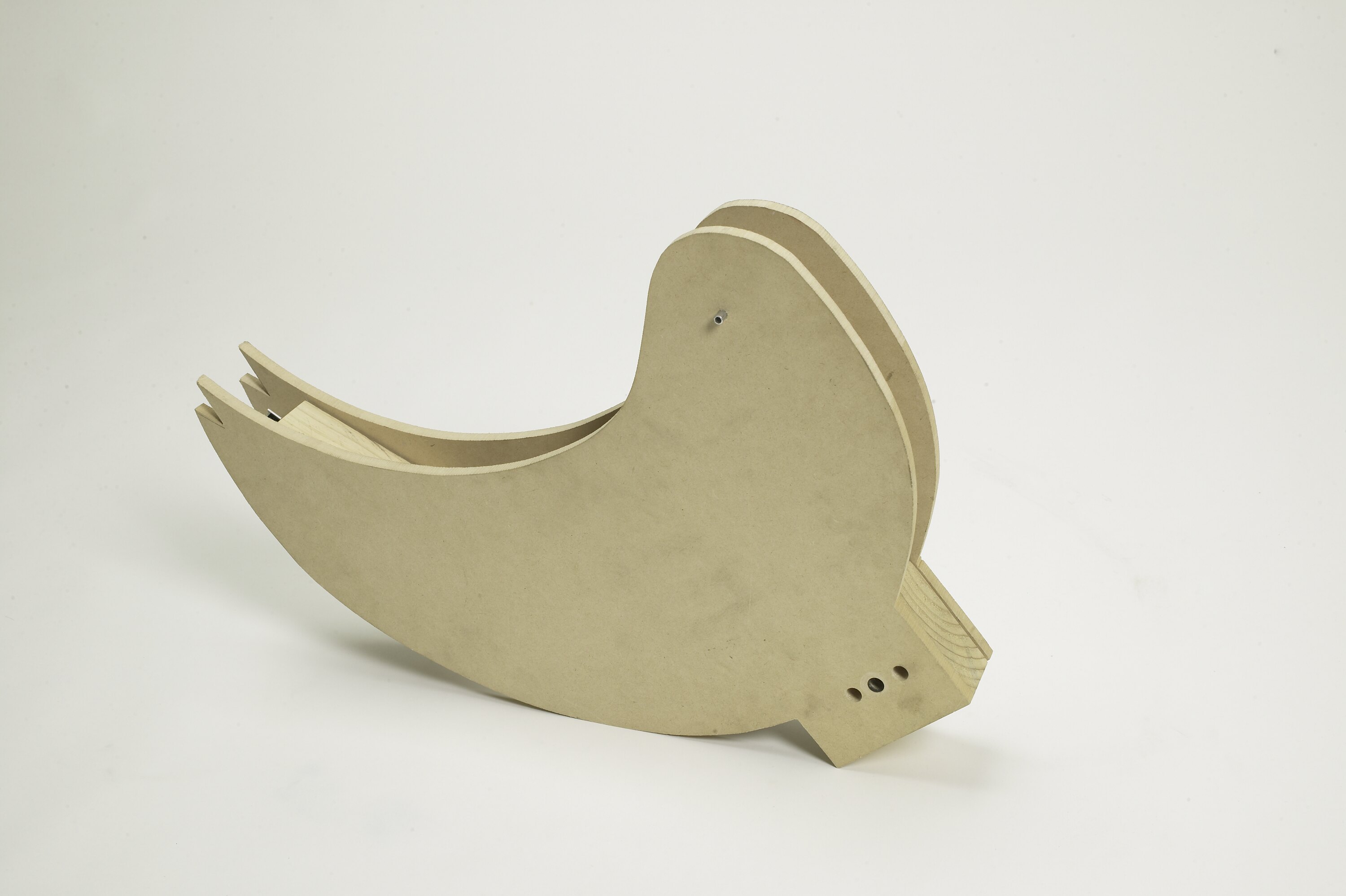 Two 'duck shaped' pieces of particle board attached with each other with wooden blocks. This unfinished shape was an early prototype for the body shape of the Toy Duck that appeared in the Opening Ceremony of the Melbourne 2006 Commonwealth Games. This prototype is one of the objects collected to document the developmental process behind the staging of the Ceremony. Designed by Christina Smith, and built by members of the Ceremonies Workshop, headed by Al Martinez, this prototype was one of the earliest products from the workshop, reflecting the fact that the duck was one of the earliest elements whose place in the Ceremony was assured.