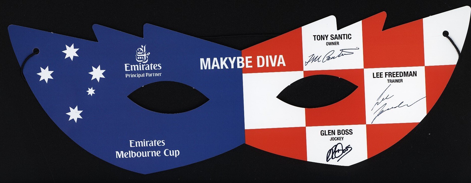 Thin cardboard crescent shaped mask, with two eye holes cut out, and a length of black elastic attached through a small hole on either side. The front is decorated in Makybe Diva's racing colours of blue, black and white (which represent the colours of the Croatian flag, the birthplace of Tony Santic) and the Southern Cross, with printed name of the horse, as well as the name and signatures of her owner, trainer and jockey. The Emirates logo is printed at the top, and `Emirates Melbourne Cup' is printed at the bottom.