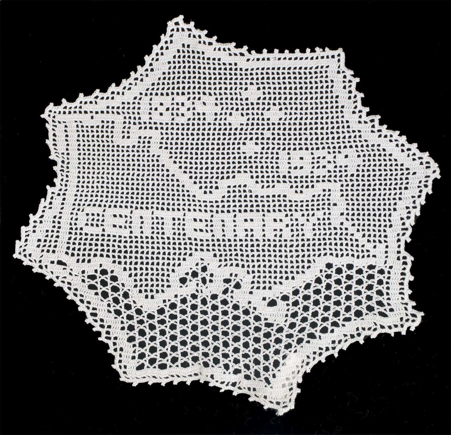 This hand made doily was made to commemorate Victoria's centenary in 1934. Small white doily, crocheted in filet crochet, made from white cotton.