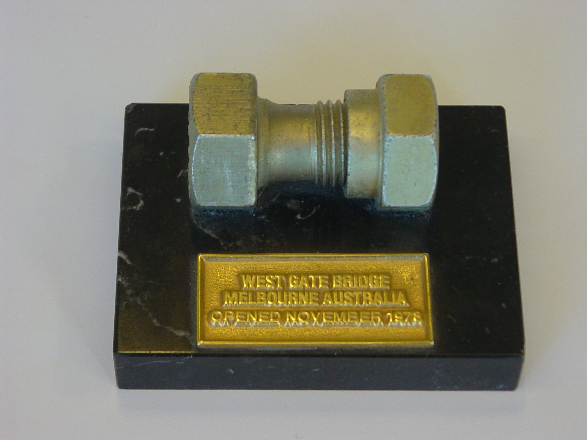 On plaque: 'WEST GATE BRIDGE / MELBOURNE AUSTRALIA / OPENED NOVEMBER 1978' On back: Half a million Ajax bolts, / identical to this/one, have been used in the / construction of the steel spans of / West Gate, Australia's / largest Bridge.