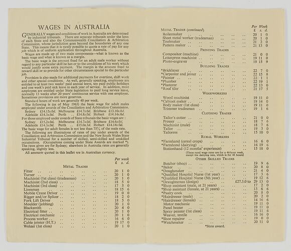 Pamphlet published by the Department of Immigration, Australia House, London in 1963 to provide information on wages and taxes in Australia. It details information about wages in Australia as well as a table listing trades and wages earned per week. It also provides information on taxation (including table of annual income tax) and child endowment. The leaflet was part of the Myerscough's package of information materials as they prepared to migrate to Australia from England in 1963.