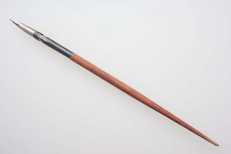 Nib Pen which belonged to Herbert Kann. Herbert was living and working in Singapore with his parents when he was detained as an enemy alien and transported to Australia for internment at Tatura. He was released from Tatura in 1942 at the age of 33. He married fellow Austrian Jew Marion Edith and worked as a fitter, draughtsman and electrical engineer.