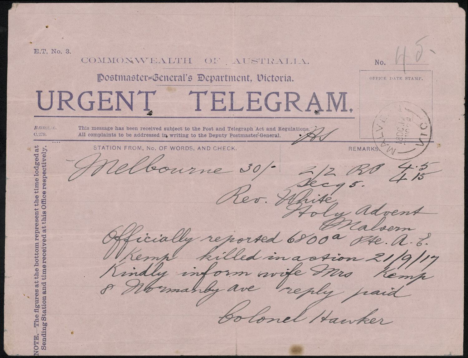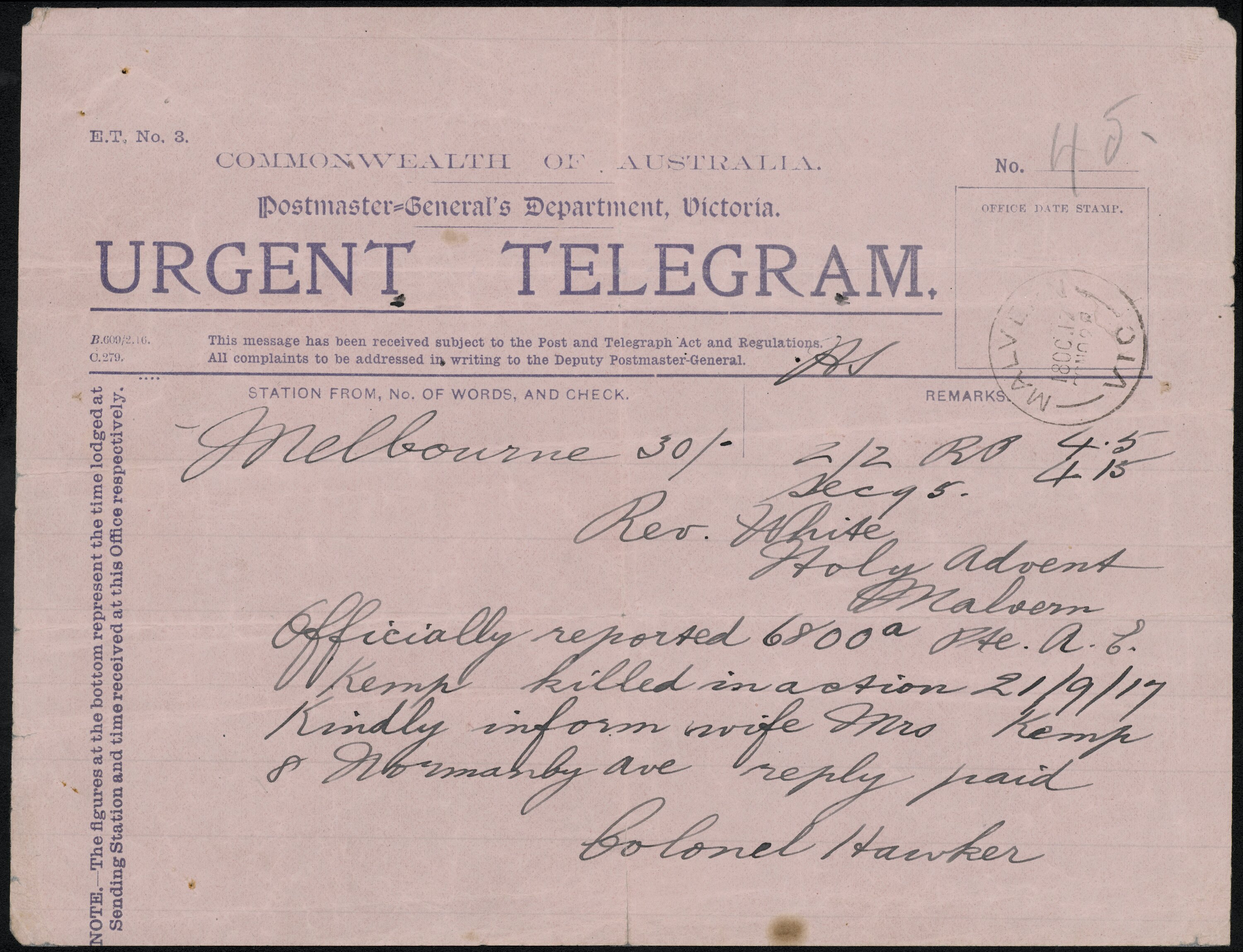 Text: COMMONWEALTH OF AUSTRALIA/Postmaster-General's Department Victoria./URGENT TELEGRAM/Rev. White/Holy Advent/Malvern/Officially reported 6800a Pte. A.E./Kemp killed in action 21/9/17/Kindly inform wife Mrs. Kemp/8 Normandy Ave reply paid/Colonel Hawker.