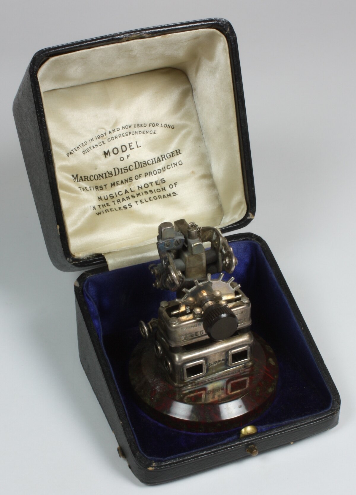 Text, lid of box: SOUVENIR/OF THE/International Radiotelegraphic Conference/LONDON 1912/FROM/MARCONI'S WIRELESS TELEGRAPH COMPANY LTD. Text, inside lid of box: PATENTED IN 1907 AND NOW USED FOR LONG/DISTANCE CORESPONDENCE/MODEL/OF/MARCONI'S DISC DISCHARGER/THE FIRST MEANS OF PRODUCING/MUSICAL NOTES/IN THE TRANSMISSION OF/WIRELESS TELEGRAMS. Text, front of lighter: MARCONI WIRELESS/TELEGRAPH CO. LTD.