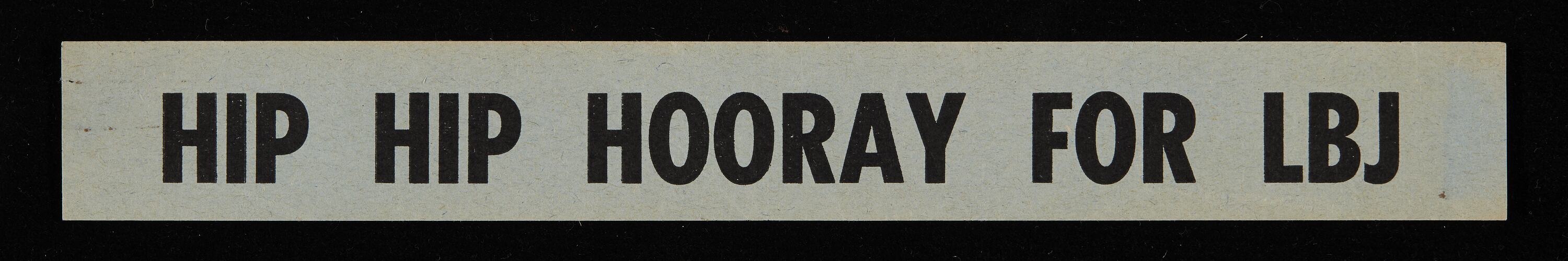 One of 15 pieces of tickertape coloured blue - each consisting of an elongated rectangular piece of thin paper, which has `HIP HIP HOORAY FOR LBJ' printed in large black type on the front side.