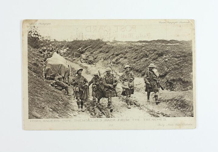 Text, front: Official Photograph Crown Copyright Reserved/HIGHLANDERS PIPE THEMSELVES BACK FROM THE TRENCHES/37 Daily Mail Battle Pictures. Text, reverse: Passed/by/Censor/POST CARD/Daily Mail BATTLE PICTURES/Official War Photographs/CROWN COPYRIGHT RESERVED/Series 5 No. 37/Our gallant Highlanders, who love/to charge the enemy to the skirl of the/pipes, are fond of playing their national/music in lighter mood, as seen in this picture/Dear Mother/I now send along to/you with best of love hoping/this will find you in best/of health as it leave myself/at present also father love/it is a very pretty place/France the weather is good/just now and the bloom of/wildflowers here are some/thing worth talking about/with best of luck of safe/return to you all.