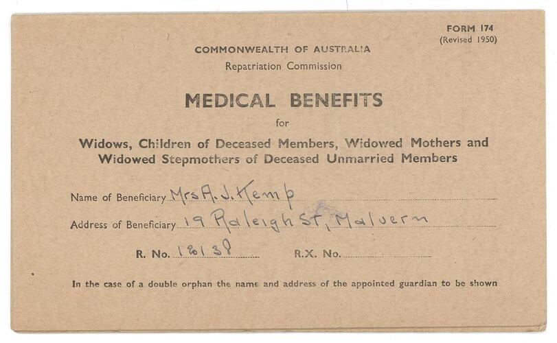 Text, front of card: FORM 174/(Revised 1950)/COMMONWEALTH OF AUSTRALIA/Repatriation Commission/MEDICAL BENEFITS/for/Widows, Children of Deceased Members, Widowed Mothers and/Widowed Stepmothers of Deceased Unmarried Members/Name of Beneficiary Mrs. A.J. Kemp/Address of Beneficiary 19 Raleigh St, Malvern/R. No. 12138 R.X. No./In the case of a double orphan the name and address of the appointed guardian to be shown.