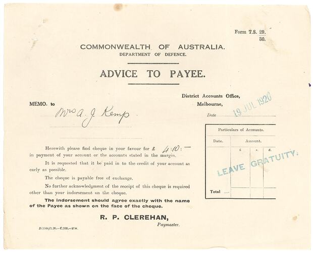 Memo from the Department of Defence advising Mrs Annie Kemp that she is receiving a cheque for £4/10 - leave gratuity for her late husband Private Kemp, killed in action on 21 September 1917. The memo is dated 19 July 1920.