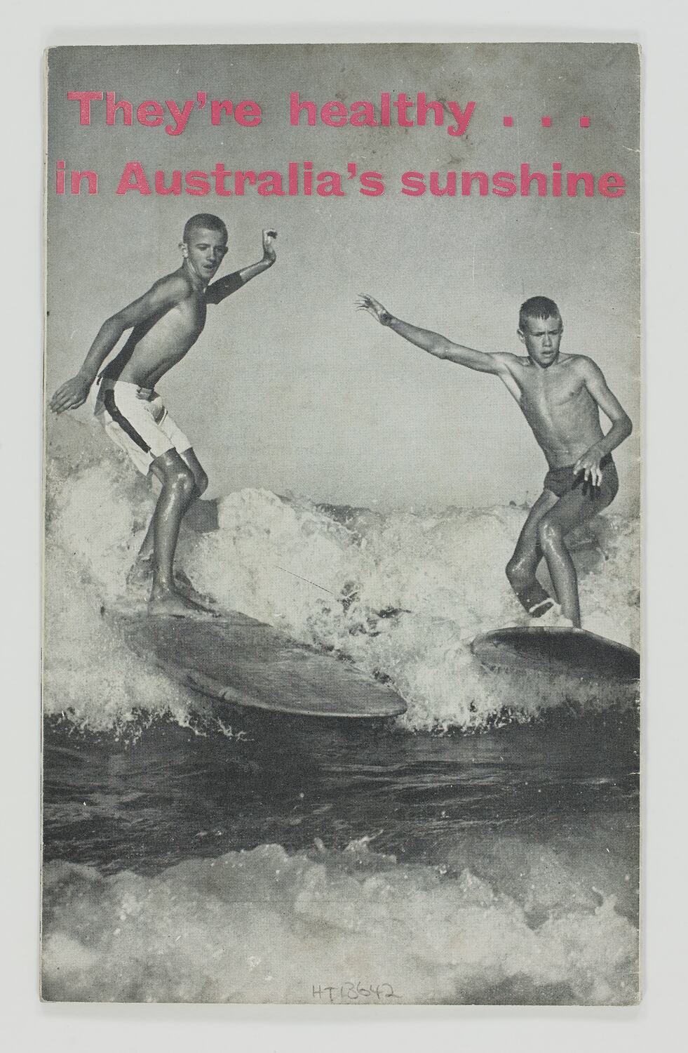 Soft paper cover. Two staples in spine. 15 pages. B/W images. Black text. Headings in red text. Front cover entitled: 'Facts About Health and Social Services in Australia.' Edition No.4. Dated: April 1962. Fact pamphlet No 1 (health and social services). Published by the Department of Immigration Australia House, Strand, London WC 1. Printed in England. Front cover is marked with words written in blue pen. Back cover has image of teenage boys surfing with the words: 'They're healthy.in Australia's sunshine'.