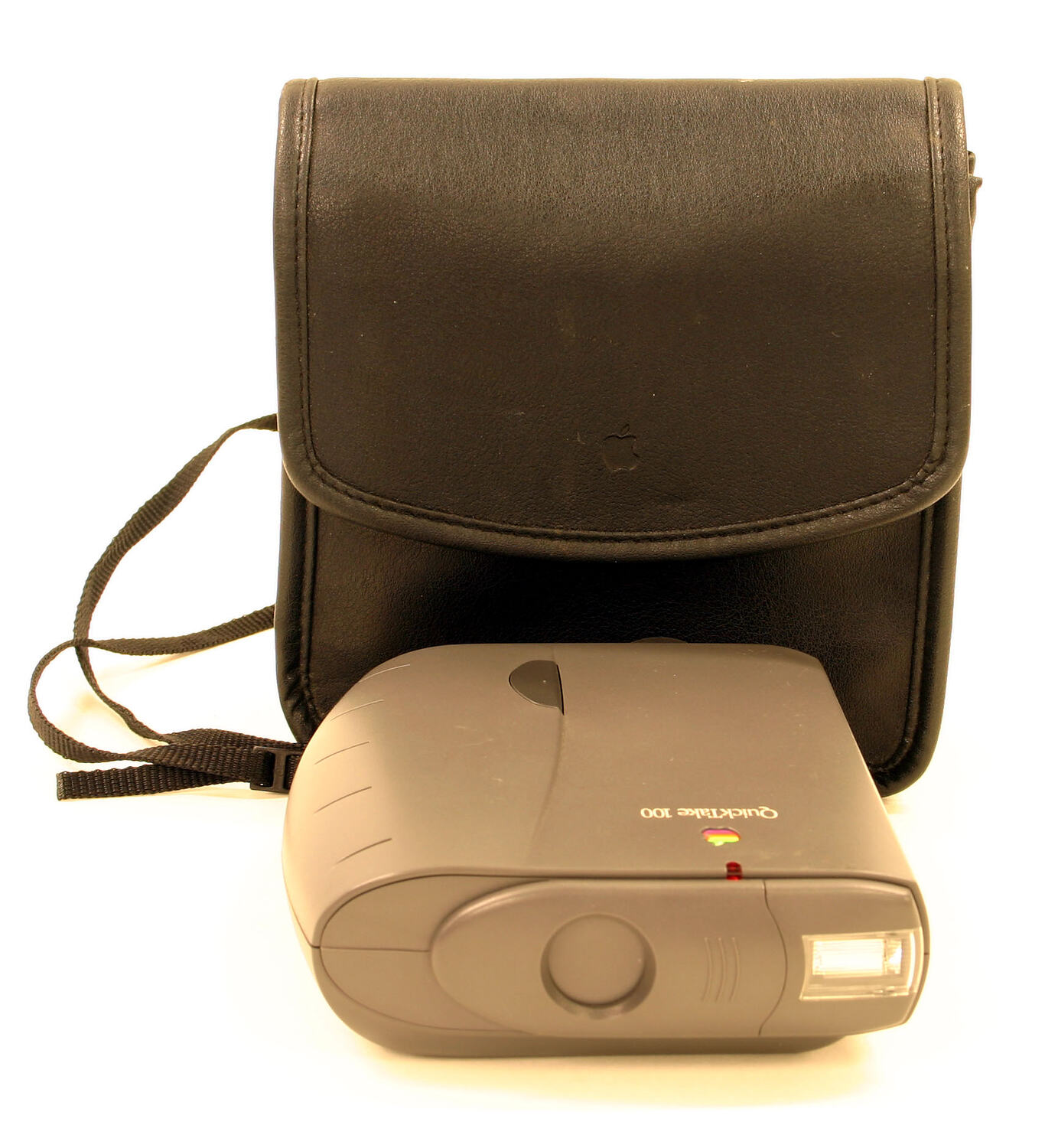 Apple QuickTake 100 digital camera with connecting cable, carry bag and battery booster, released in 1994. It is a moulded grey plastic digital camera with focus and aperture adjustment, inbuilt flash, carry strap and vinyl carry case. It could be connected to any Macintosh by way of an Apple serial cable. It is believed that the QuickTake 100 was built for Apple by Kodak.