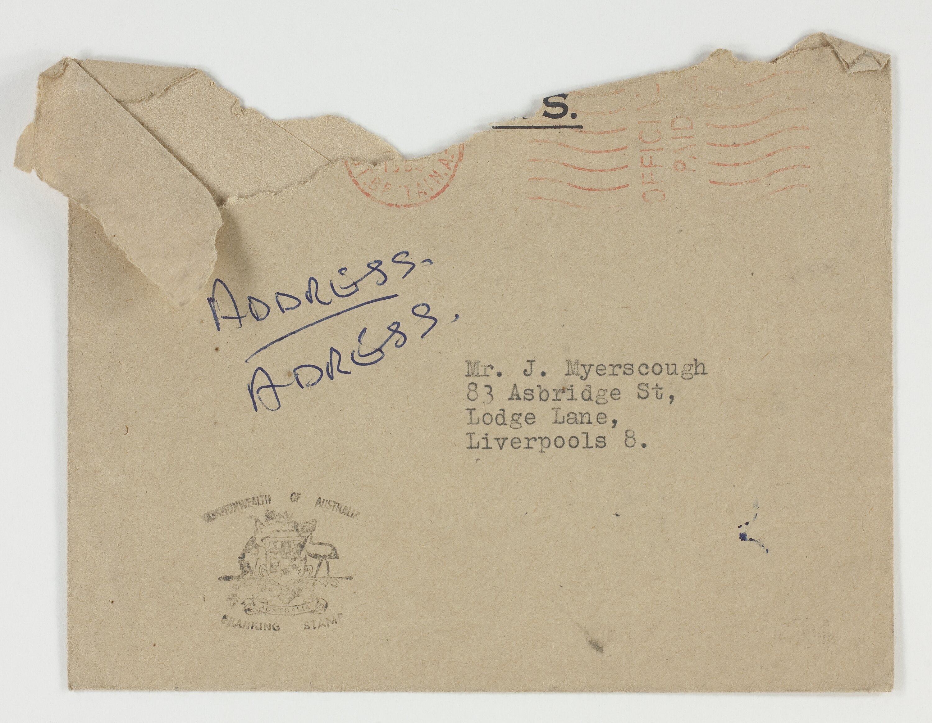 Soft paper envelope. Brown with black text. Red post office stamp. Blue Commonwealth of Australia stamp. Envelope torn when opened.