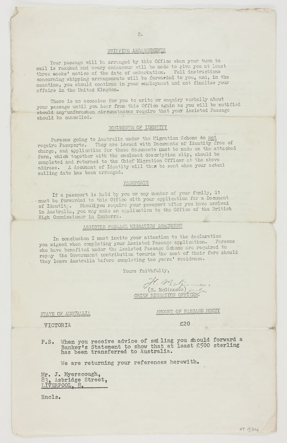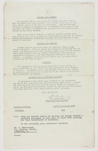 Letter dated 27/3/1963 from the Chief Migration Officer of the Office of the High Commissioner for Australia to John Myerscough, stating his application for settlement in Australia under the Assisted Passage Migration Scheme has been approved. the state chosen for settlement was Victoria. The letter was part of the application and acceptance process for the Myerscough's to migrate from England to Australia in 1963 and kept as a souvenir of their migration experiences.