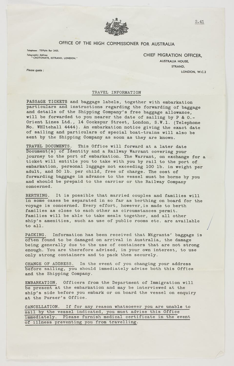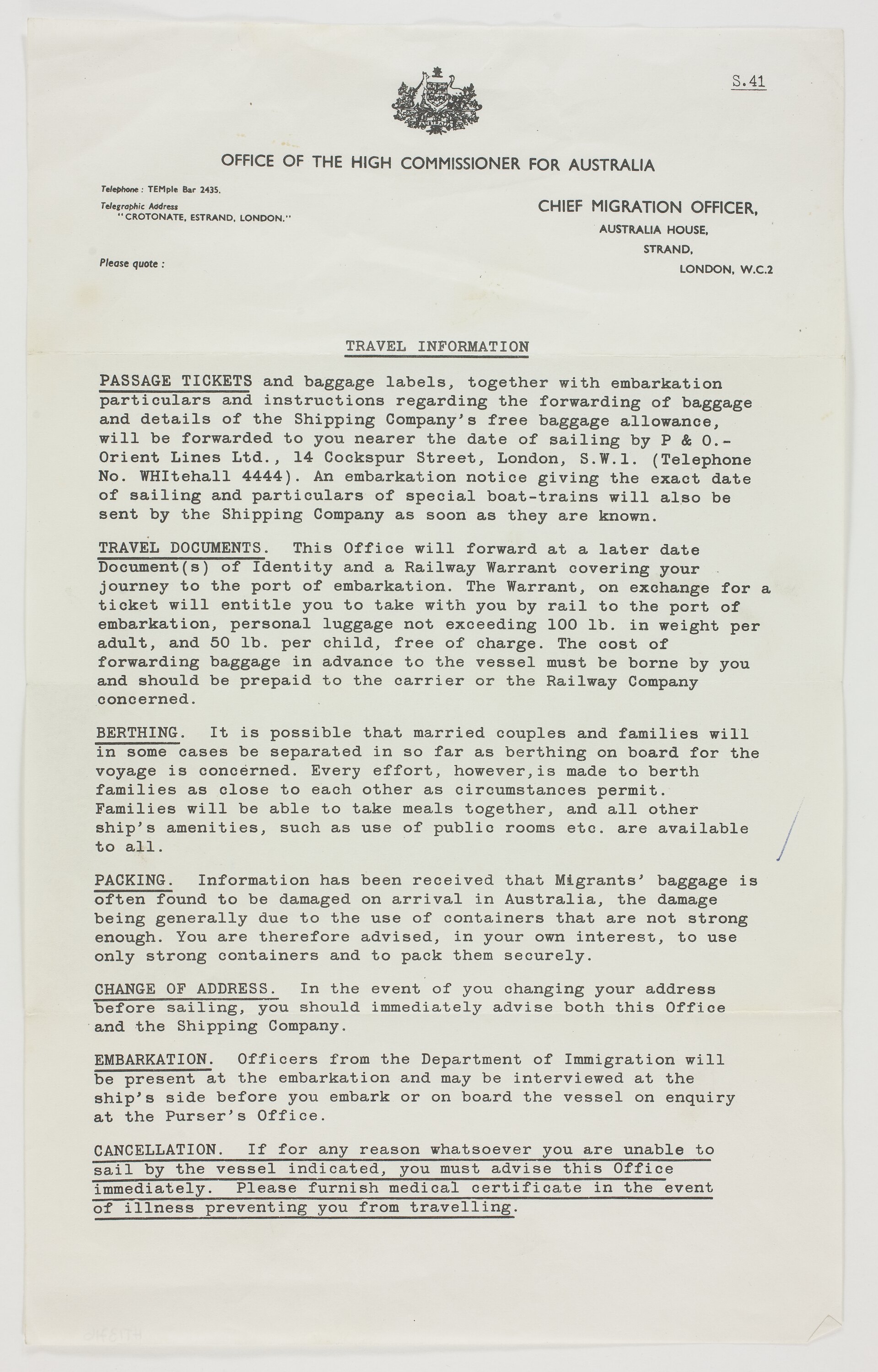 Text: OFFICE OF THE HIGH COMMISSIONER FOR AUSTRALIA/CHIEF MIGRATION OFFICER/AUSTRALIA HOUSE/STRAND/LONDON W.C.2/TRAVEL INFORMATION.