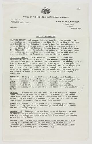 Letter from the Office of the High Commissioner for Australia regarding travel information such as passage tickets, travel documents, berthing, packing, change of address, and embarkation. The letter was part of the application and acceptance process for the Myerscough's to migrate from England to Australia in 1963 and kept as a souvenir of their migration experiences.