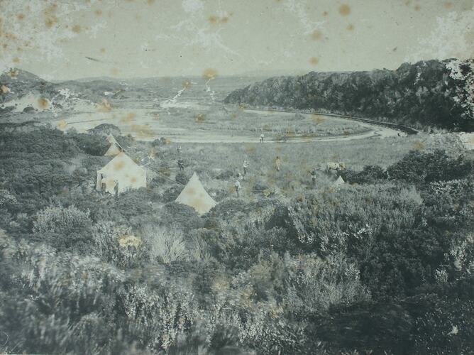 View of the estuary at Yellow Rock Beach, King Island. In the foreground, near the rivulet, is a campsite and tents set up by the Field Naturalists Club of Victoria during a scientific expedition to the island in November 1887. Some of the men from the club are standing near the tents. There is a horse to the right.