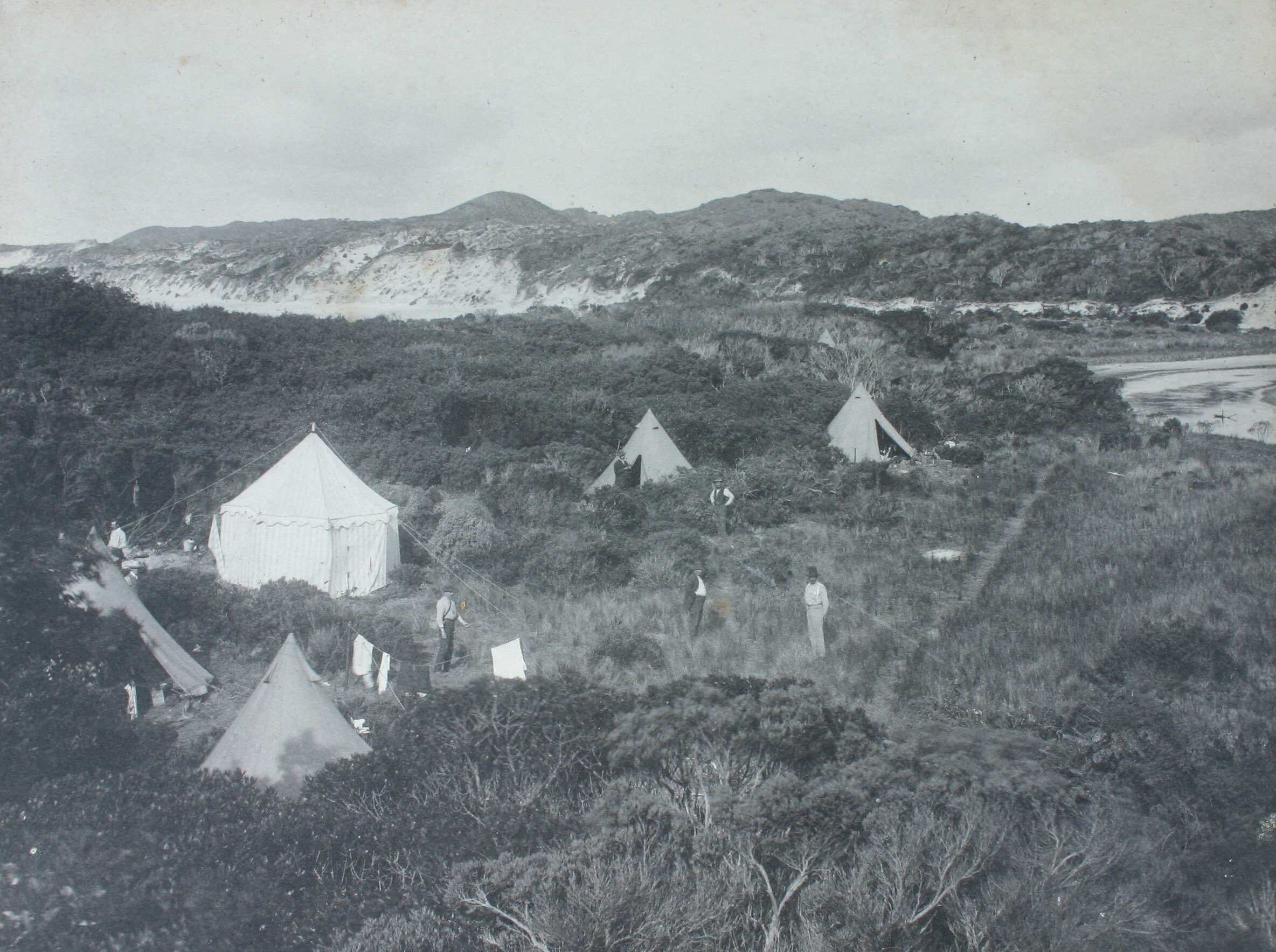 View of the estuary at Yellow Rock Beach, King Island. In the foreground is a campsite and tents set up by the Field Naturalists Club of Victoria during a scientific expedition to the island in November 1887. Some of the men from the club are standing near the tents.